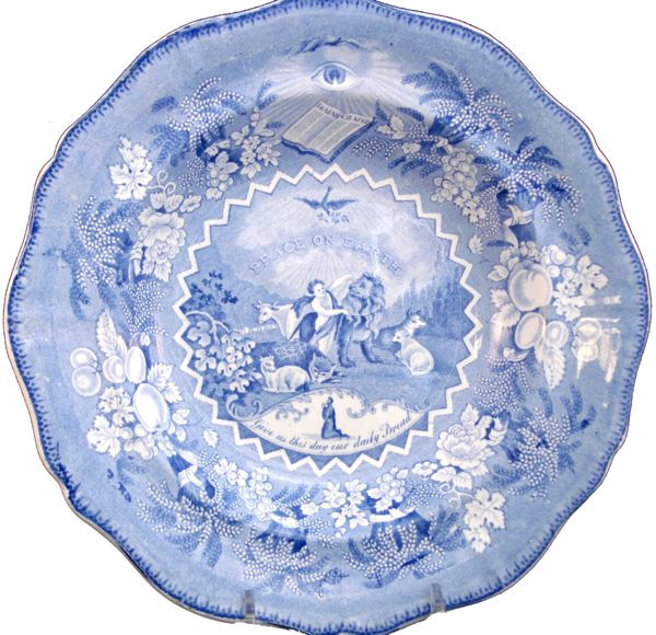 Seen here is a 10 inch plate by an unknown maker that depicts the allegorical figure of Hope. She is traditionally shown with an anchor and a ship in the distance, perhaps to allude to the hope that the sailor will return from the sea. The border is printed with six birds. The pattern is printed in black and enameled over the glaze in bright colors.