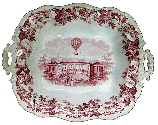 Shown is an 18.5 by 15 inch platter, Akbar’s Tomb Secundra, made by Chamberlain (s) (& Co.) 1786-1852. The pattern is part of as series of Indian views. Visit more information and other archived patterns to learn more about this pattern. The source print for this pattern is from Robert Elliot’s “Views in the East,” which was published in 1833 in London.