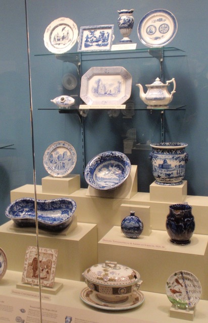 TCC members were treated to many transferware delights at our 2014 annual meeting held at Winterthur Museum, Garden and Library in Delaware. Pictured here is part of the display in the special exhibit “Transferware: A Story of Pattern and Color”; and obviously engaged meeting participants viewing various transferware-related documents and prints from the Winterthur library and archives (candid photo).
