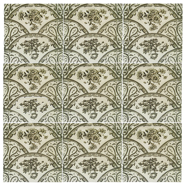 This is an unusual pattern in that it has two different centers, both of which are bouquets of flowers inside a fan shape. The border is made up of partial fan shapes that surround the floral fan shapes. The grouping of 9 tiles shows a vertical row of alternating floral fan shapes with the leaf and scroll fan shapes that made up the original border.