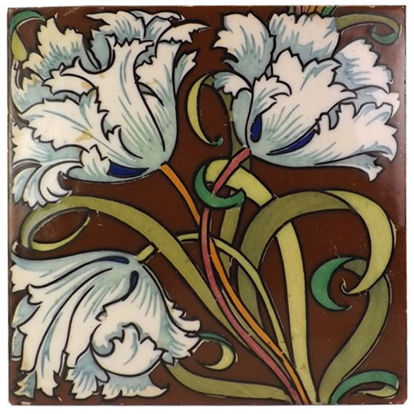 It is an Art Nouveau design with an open red blossom in each corner. The meandering stems and colorful leaves form a grid pattern in the center. The pattern would form a colorful and interesting display on a wall or fireplace as seen with the grouping of 16 tiles. A new red flower shape is formed by the corner flowers that alternates with the grid.