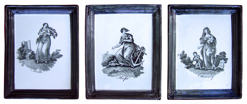 The most common designs show the three figures “Faith”, “Hope” and “Charity” (figure 1). The set illustrated is typical but there are variations: “Faith” is always shown with the cross, “Hope” with the anchor and “Charity” with three children, but the backgrounds do differ and the titles can be either in script or capital letters. Rare examples are known without the black border, or with yellow lining inside the black border. The sizes vary too.