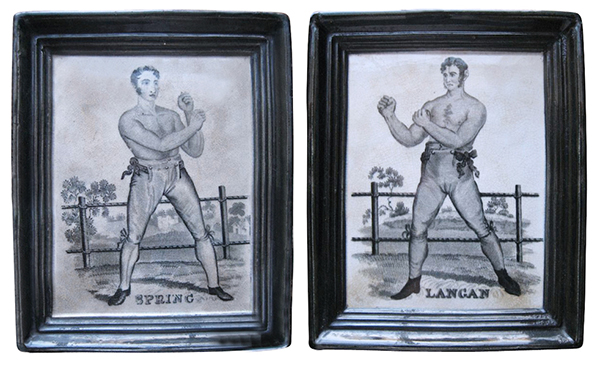 Another rare pair of plaques depict the boxers John Spring, heavyweight champion of England, and Jack Langan, champion of Ireland (figure 8). They famously fought at Worcester in 1824 for a purse of 300 sovereigns, the fight reputedly drew a crowd of some 40,000 and lasted over two and a half hours. Spring was the victor. The two boxers’ portraits appear together on another black-bordered plaque of massive size, over sixteen inches wide.