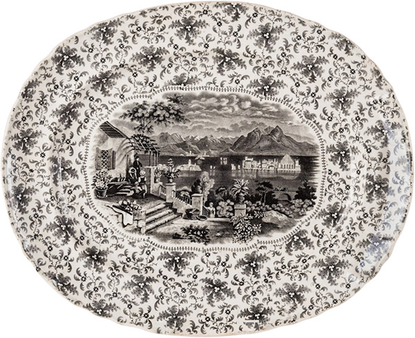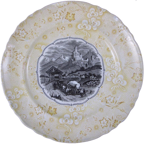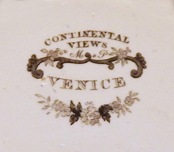 A series of individually titled views of Europe made by Machin & Potts of Burslem. The series and individual titles appear along with the maker’s initials M&P in a printed cartouche mark, and one of two different marks referring to the firm’s patent process also sometimes appears. The central views appear within a simple frame and then one of a selection of at least three different sheet borders. The firm was responsible for patents concerning techniques for printing sheet transfers, a technique they used to print these borders. Examples appear in various colours and colour combinations. The series does not appear much in existing literature, hence the few illustration references below